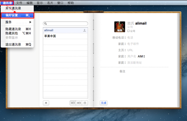 (一)点击桌面上的“通讯簿”端,点击“通讯录”->“偏好设置”