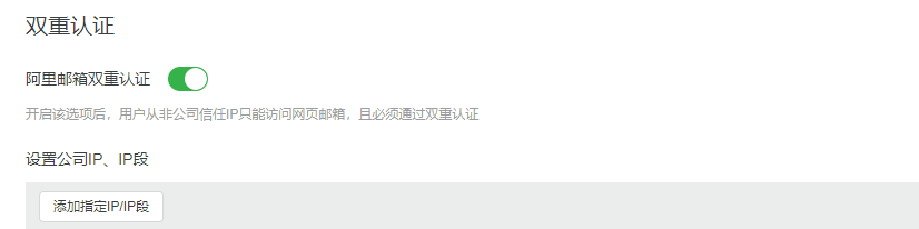 开启该选项后,用户在非公司信任的IP地址范围中只能通过阿里企业邮箱网页版登录企业邮箱,且必须通过双重认证进行鉴权登录。